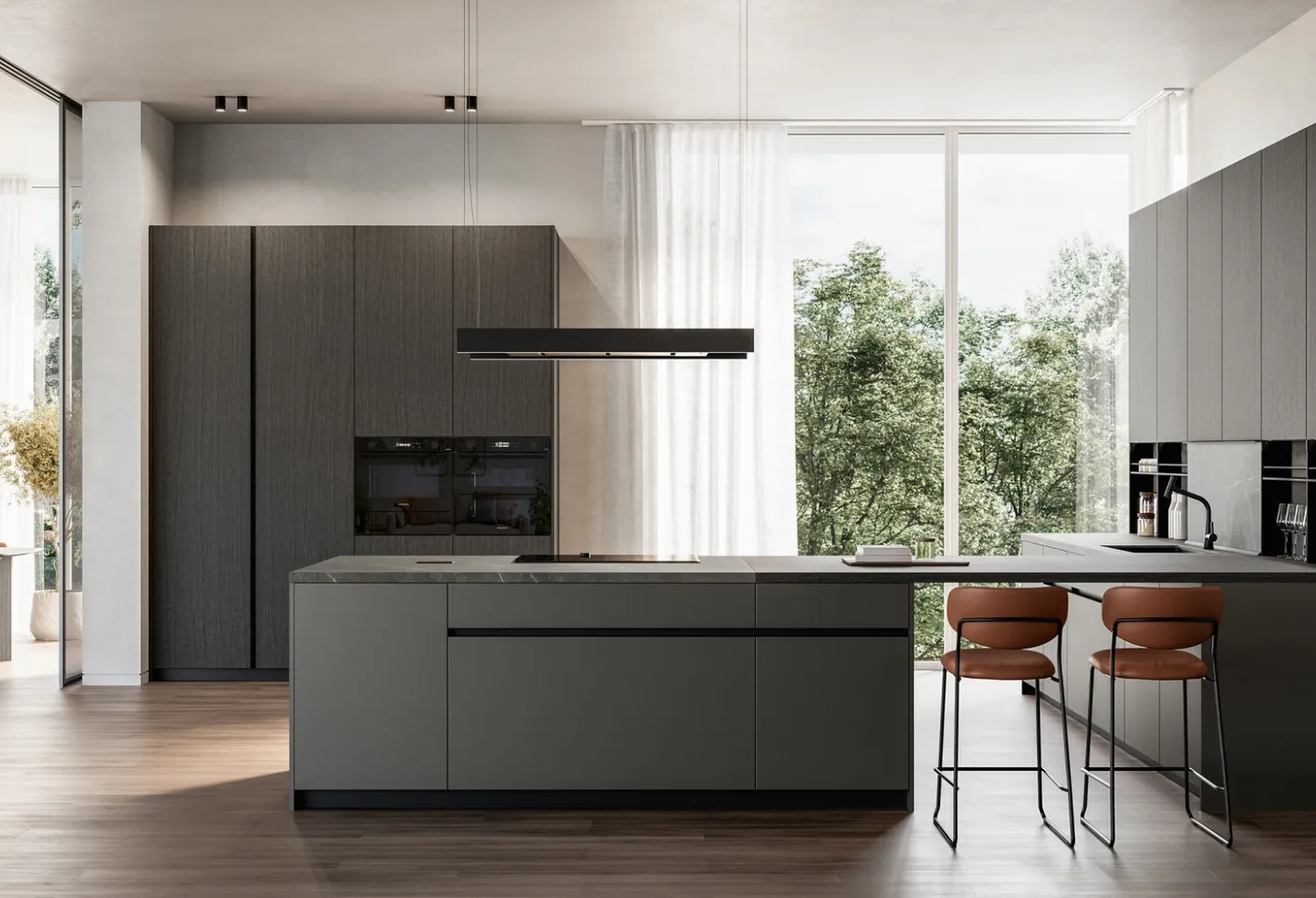 Si vous souhaitez une cuisine moderne Arredo3, Time 02 en laqué mat vous attend dans notre magasin de Cuisines Modernes avec îlot central.