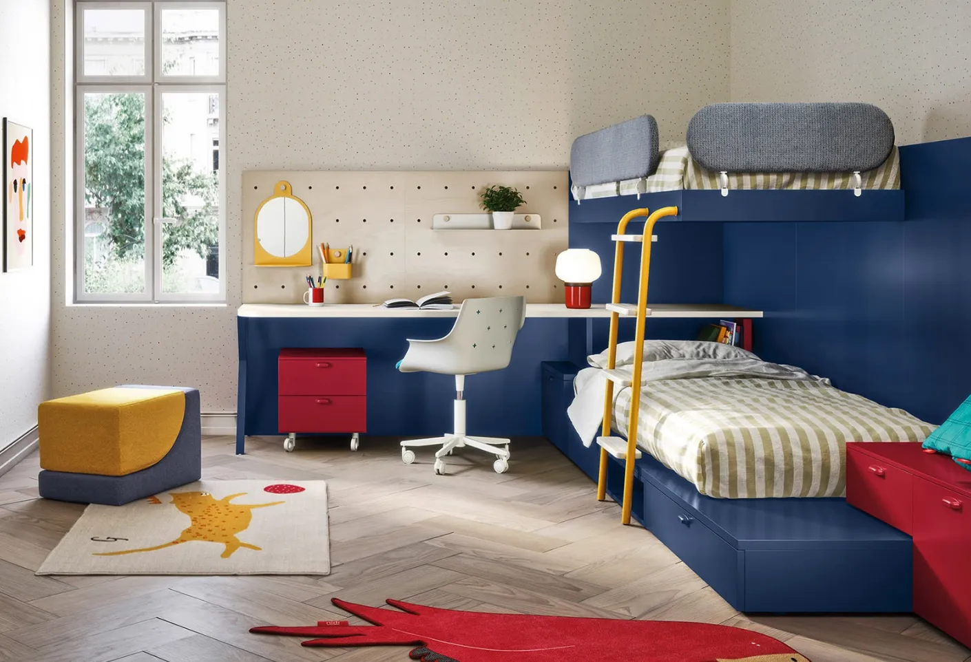 Apportez de la valeur esthétique et des couleurs vives dans la chambre des plus jeunes avec cette proposition, l'une des Chambres avec lits superposés pour enfants de Nidi. Dans la conception de la chambre des jeunes confiée à nous: dans notre magasin nous proposons toutes les compositions modernes les plus originales pour leur chambre. Cette solution en mélaminé améliore parfaitement les qualités pratiques et esthétiques de la chambre, car elle est capable de conjuguer fonctionnalité et ergonomie. Nidi propose une large gamme d'accessoires à composer sur mesure : vous trouverez un lit, une armoire, un bureau, des chaises et des bibliothèques.