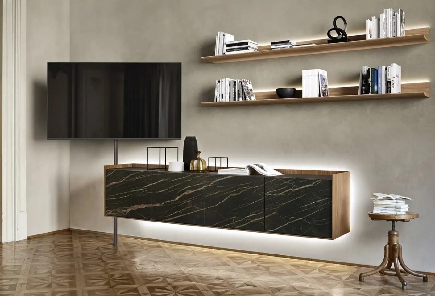 Si vous souhaitez concevoir des séjours design, entrez et découvrez le meuble TV Video de la marque Sangiacomo, fabriqué en bois.