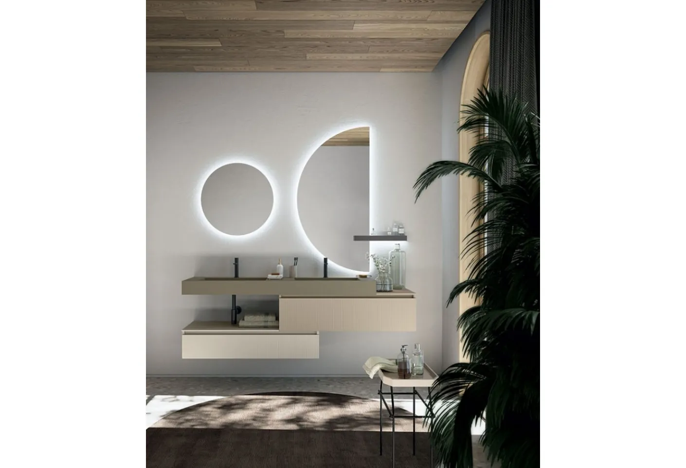 Décorez la pièce du bien-être moderne parfaitement avec le Signe 04, des meubles de salle de bain suspendus et des objets laqués mat de Cerasa