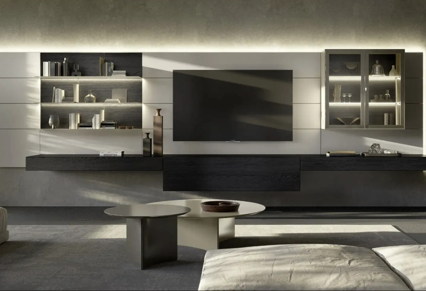 Veux-tu concevoir un séjour pratique et dynamique ? Voici pour toi le mur équipé Domino Boiserie 04 de Sangiacomo aux formes modernes et marquées.