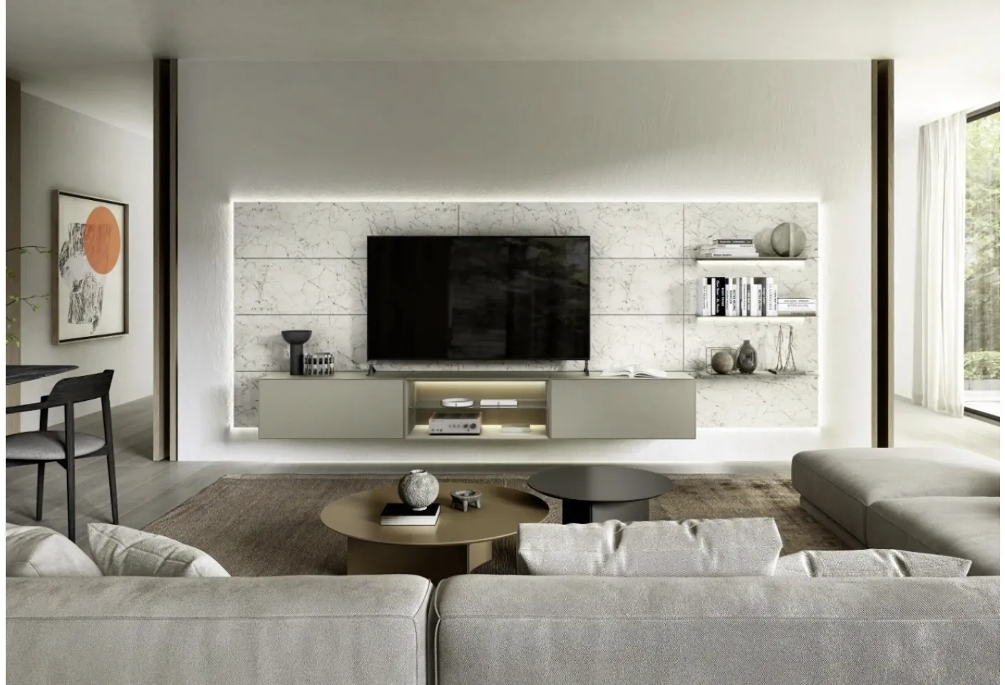 Veux-tu aménager un salon pratique et fonctionnel? Nous te proposons le mur équipé Domino Boiserie 05 de Sangiacomo aux lignes modernes et affirmées.